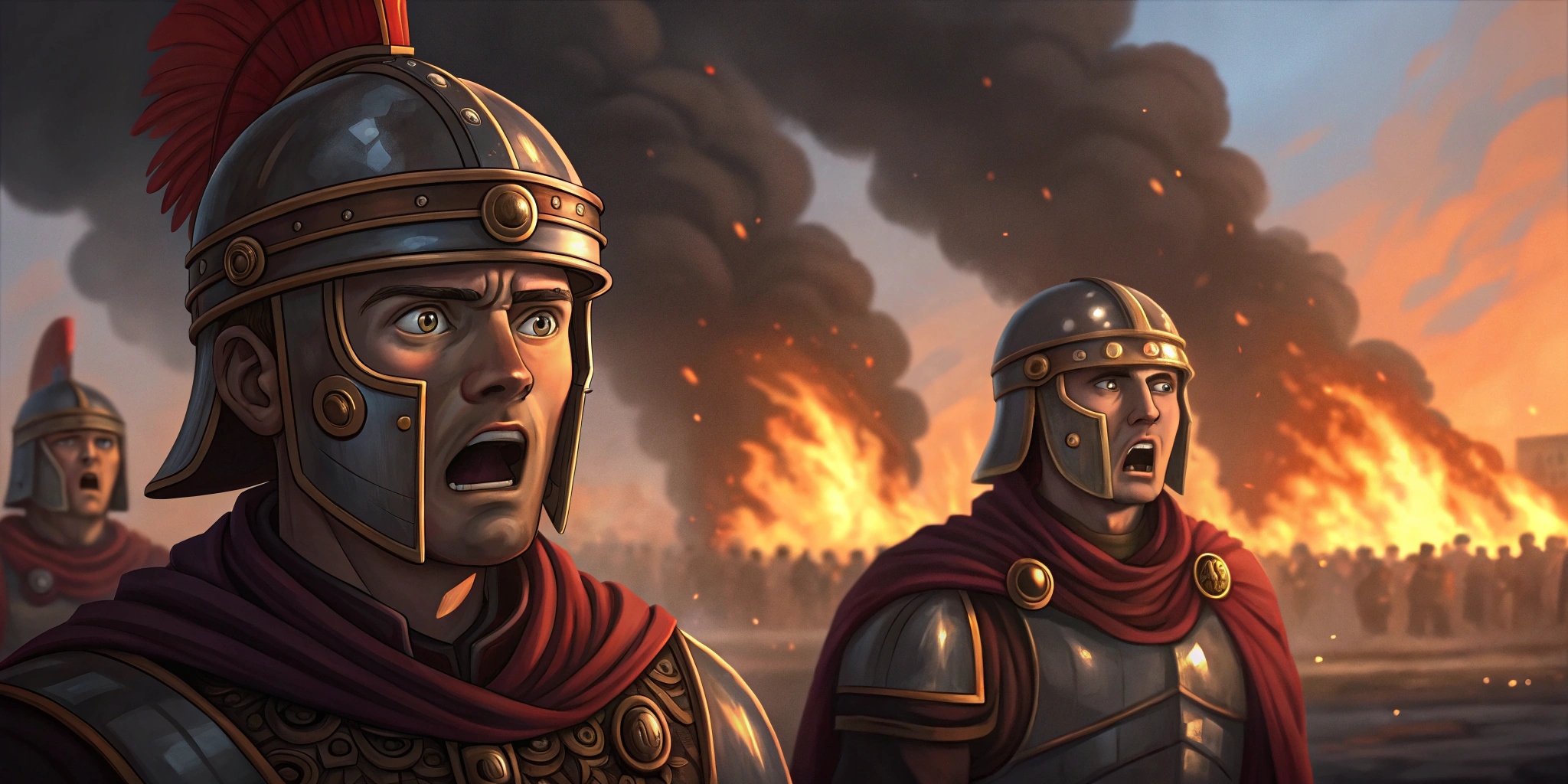 Shortly after sunrise, long columns could be seen wading slowly through the ashes. Some legionaries burned their poorly protected feet and retreated to the camp. No one had the will to fight anymore. They wanted to stuff the rich treasures into their empty pockets, but were unwilling to do anything for them. They reached a cross street that connected the three main roads. The fire had spread as far as this point. A massive stone wall on both sides of the cross street had prevented the inner core of the city from also being engulfed in flames. The Roman army, which had been split along the three main roads, found itself reunited here. Spurius, the leader of the burn squad, who boastfully called himself “the capable one,” had to acknowledge that his irresponsible actions had done more harm than good.