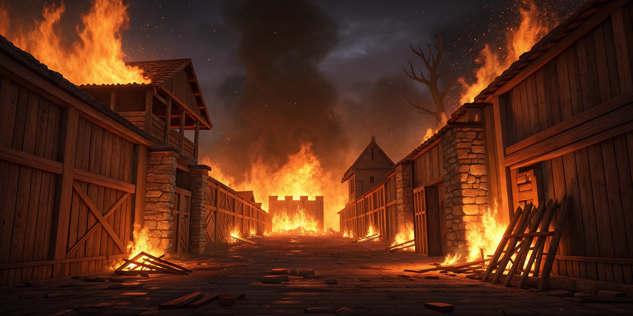 Some shot fire arrows into the easily ignitable wooden walls, others set fire to the wooden debris lying in the street. A breeze blowing in from the sea fanned the embers into a steadily rising heat.