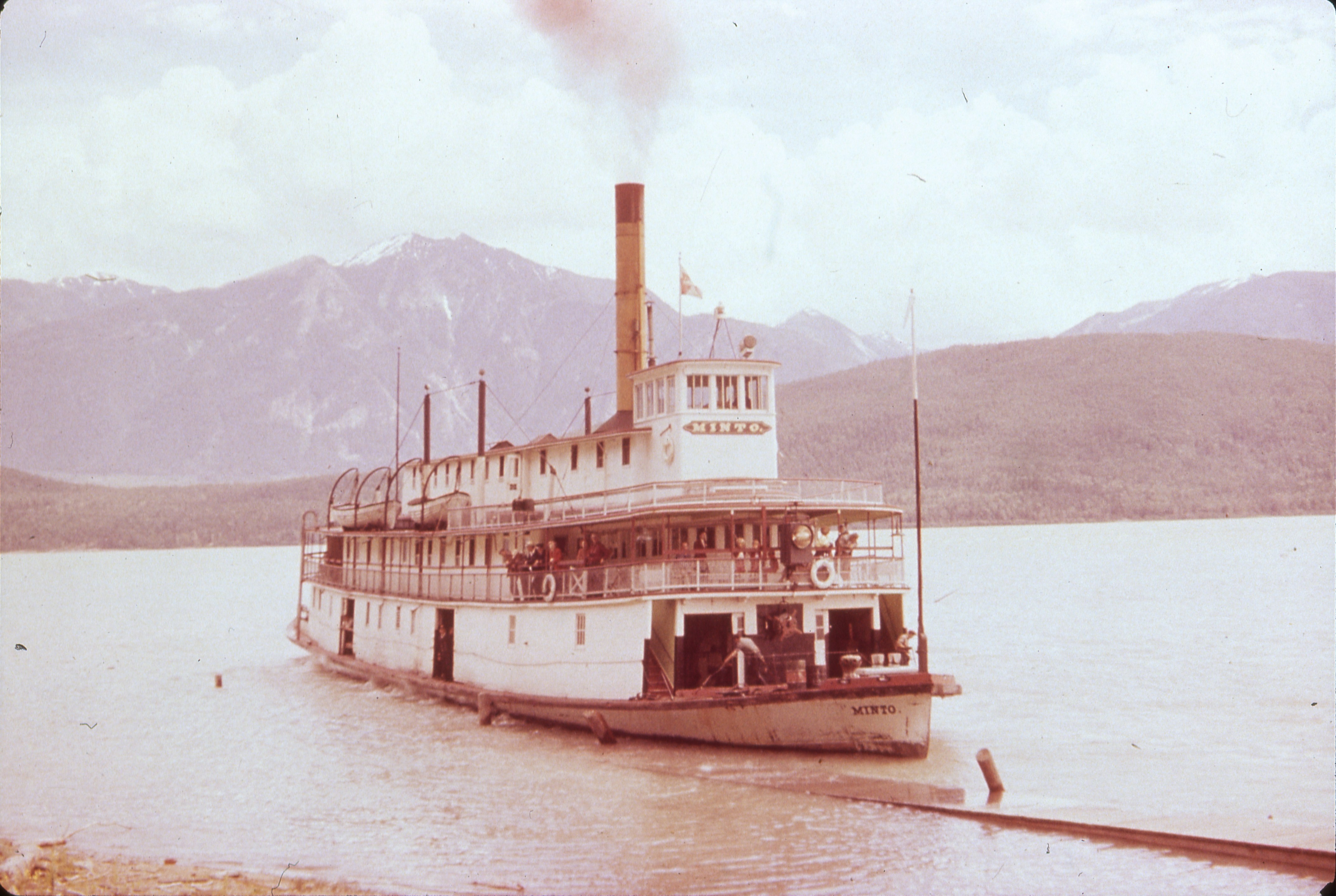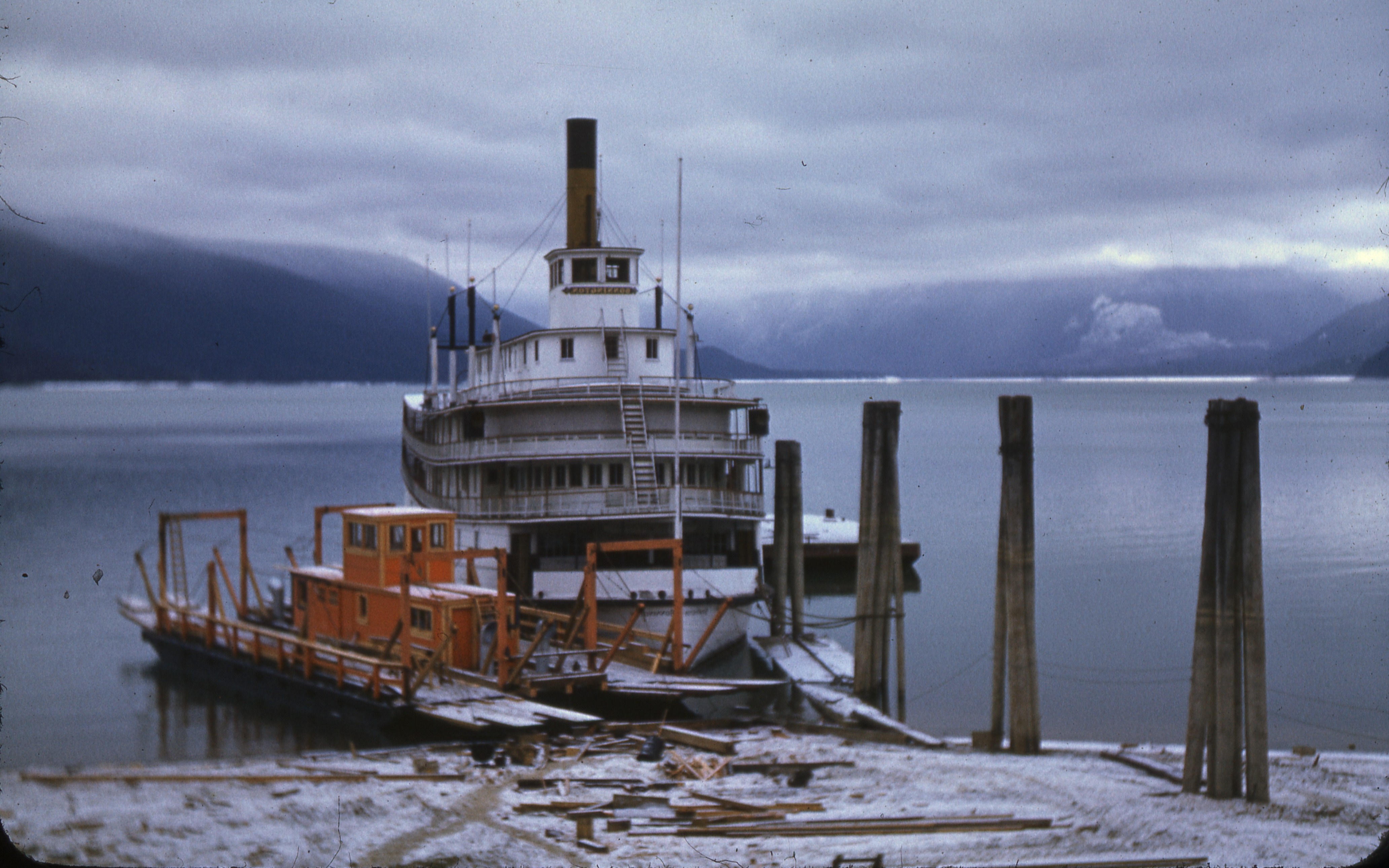 1898 – SS Minto built in Nakusp, parts from Toronto, shipped to Nakusp in 1000 parts. First steel hull on the Arrow Lakes and named after Canada’s Governor General. It was meant to go to the Stikine River for the Gold Rush. The picture was taken at Arrowhead on Upper Arrow Lake, 1952.