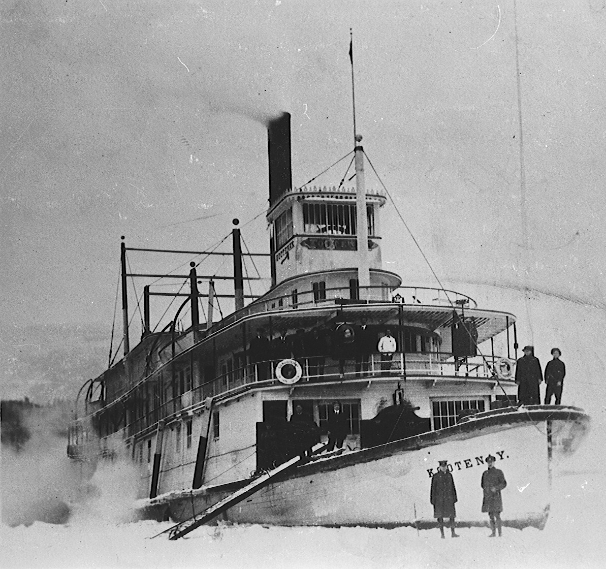 1897 – SS Kootenay built in Nakusp and launched in April – group posing in front of sternwheeler on frozen Upper Arrow Lake ca. 1920