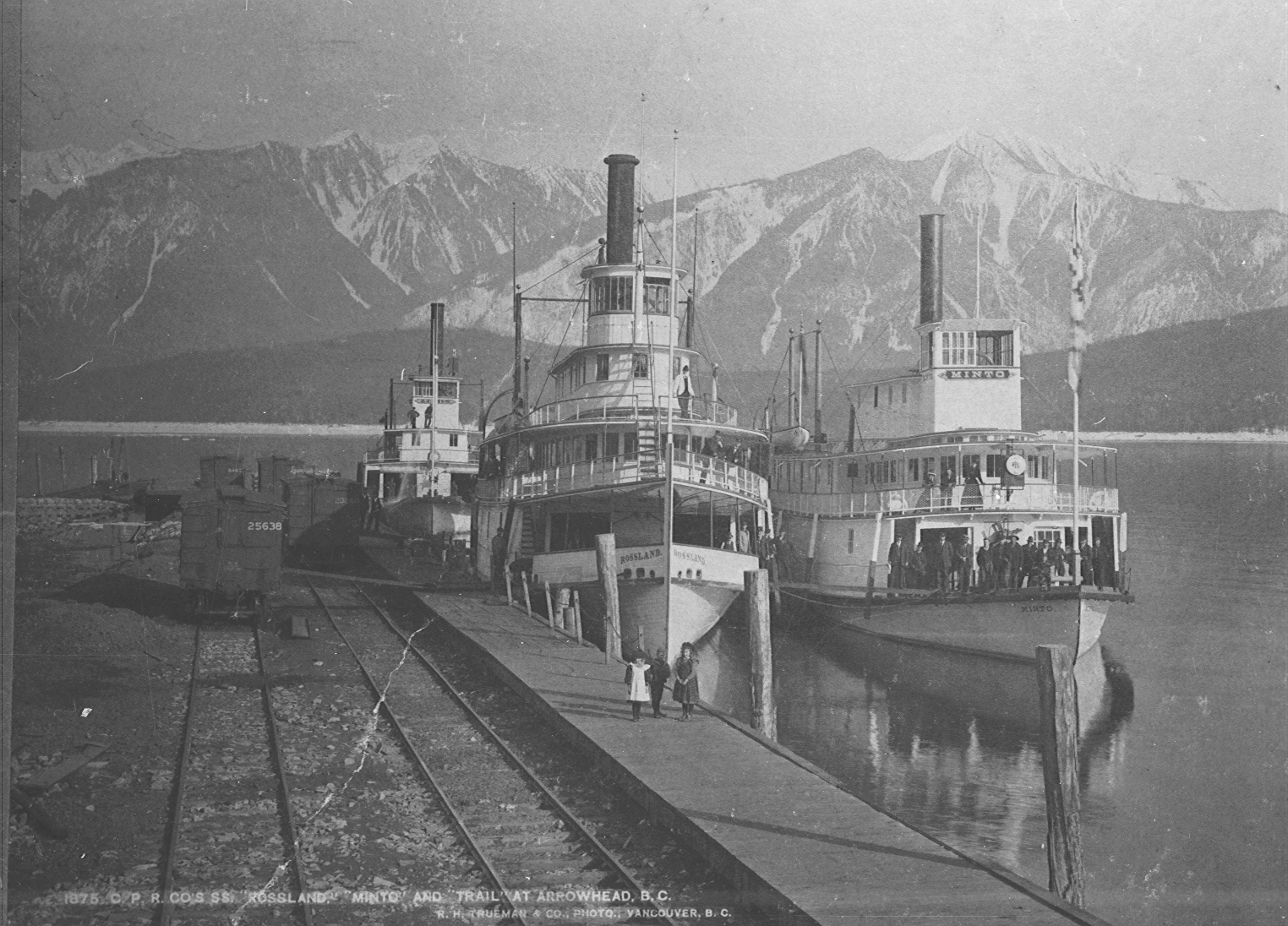 1896 – SS Trail built in Nakusp, used to haul freight and to push a barge from Revelstoke to Trail. The barge carried coal for the smelter in Trail, then she hauled ore from the smelter to Northport. Here she is docked behind the Rossland at Arrowhead, Upper Arrow Lake, 1898.