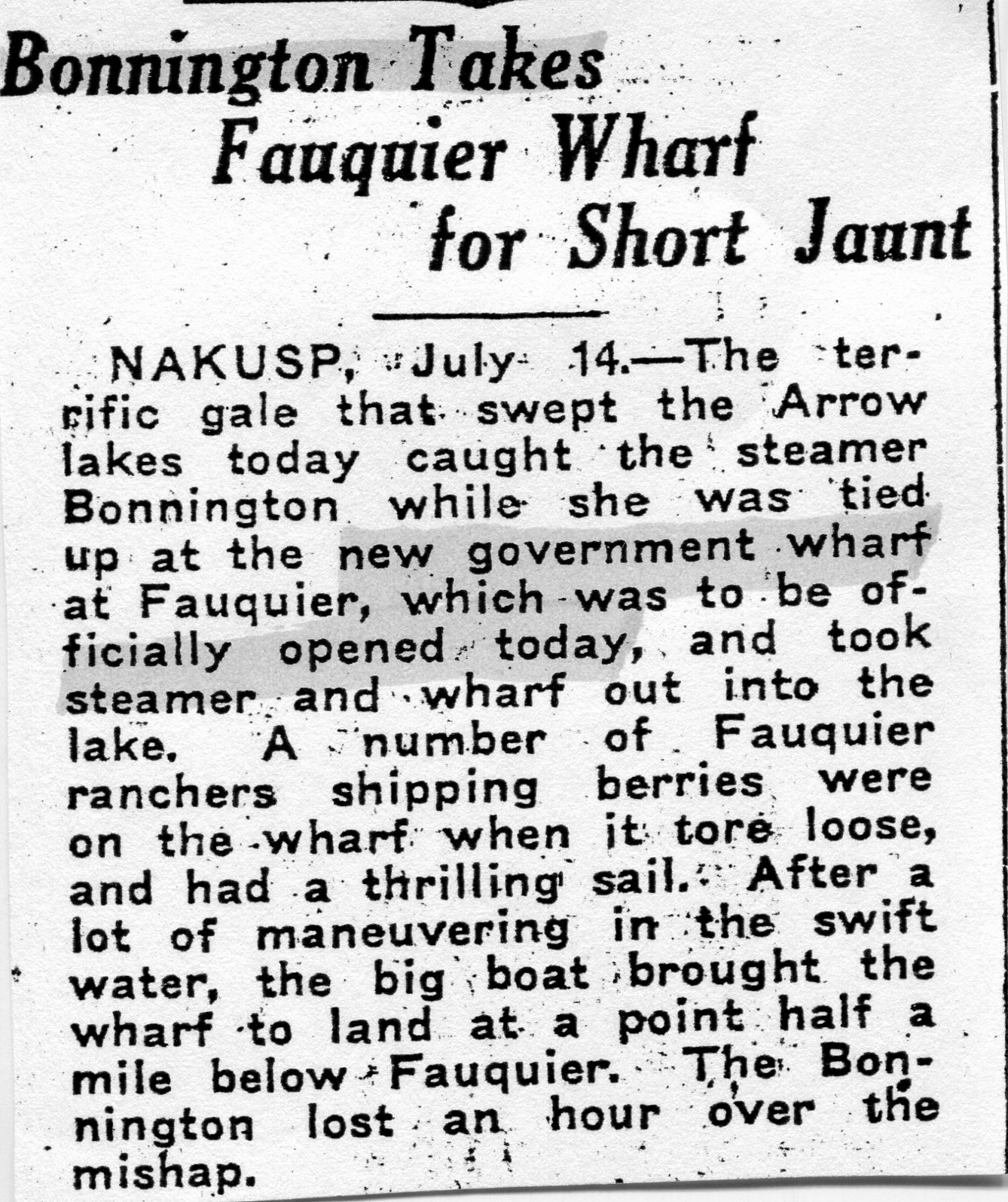 After Mr. Fauquier’s death the farm was put up for sale. In 1920 Mr.E. Kendrick, bought the part south of the road and the Cutting brothers the north portion. The same year Mr. Gaustin and family arrived and Mr. Scribe bought the Thompson farm. During the twenties fruit-growing reached its peak. Hundreds of crates of cherries, plums and small fruits were shipped, also many carloads of apples. The beach landing no longer sufficed and a wharf was built. The growers formed a Coop and built a packing house. The dock was crowded daily during the summer with fruit, shippers and onlookers who thrilled at the sight of the Bonnington, with passengers lining the rails of both decks. This was Fauquier during its heyday.