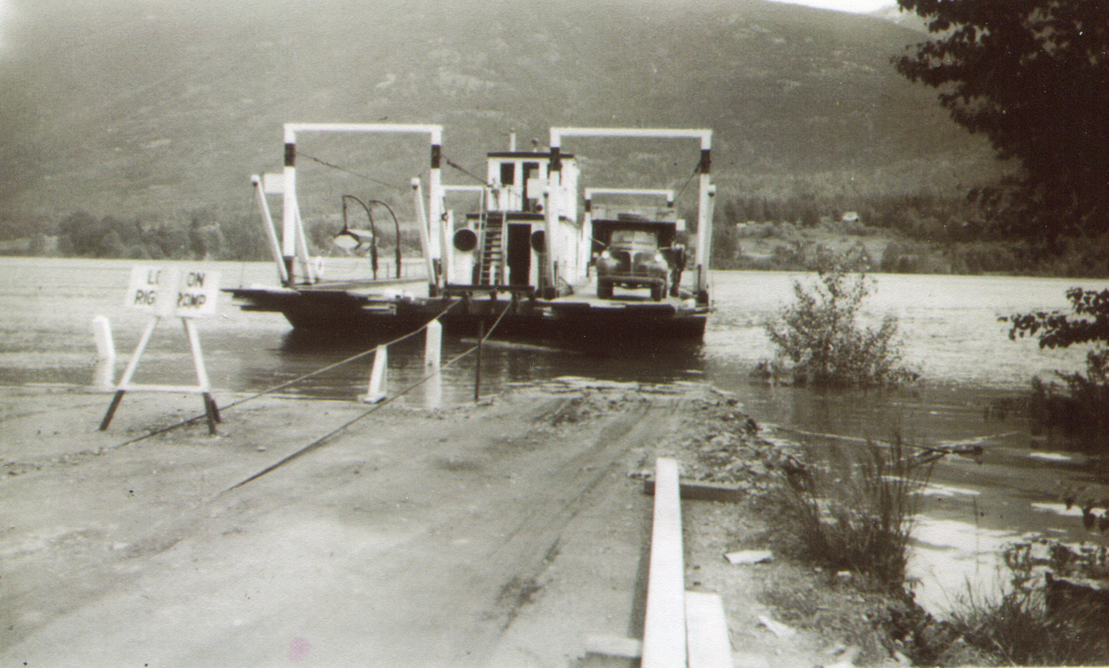 As reported the first ferry to cross the Arrow Lakes between Needles and Fauquier was a 6 HP launch in 1919. In 1922, a raft towed by Mr. O.J.Aspinall’s rowboat was used. By 1924, hourly daily service was started by Mr. George Craft consisting of a boat for foot passengers and a raft for vehicles powered by a small boat called the “Kathleen.” In 1928, Claude Rollins was engaged to give better service with a larger boat. In 1931 a three-car ferry was installed. 1941 saw an eight-car cable ferry put into use. As the years went on, the increase in traffic warranted larger ferries and more hours of operation.