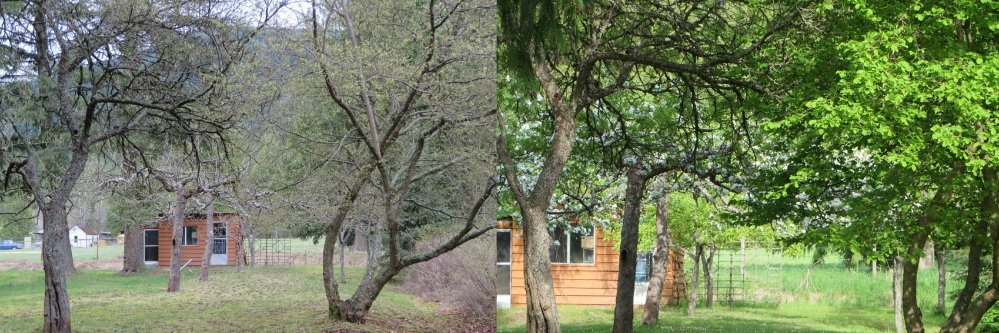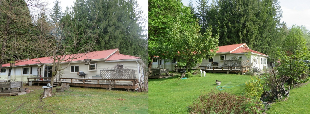 You may wish to go back to the previous post that showed the difference of two weeks. What the pictures show below is the contrast between April 12 and May 12 in our yard. The next comparison will happen in a month, when we will be approaching the beginning of summer here in Fauquier, British Columbia.