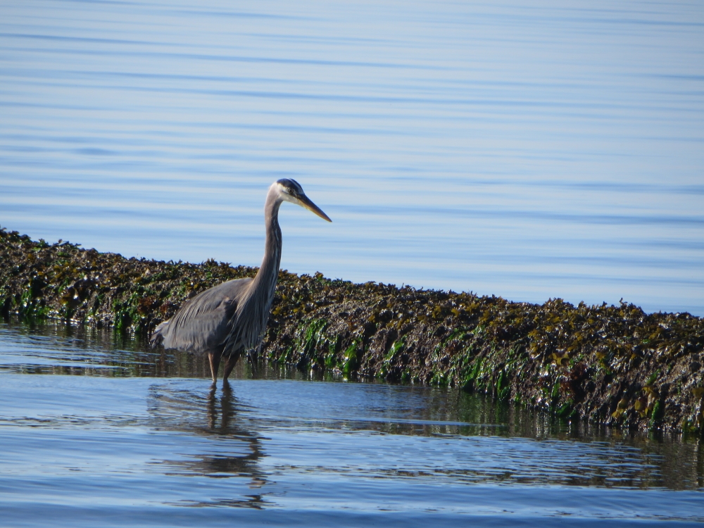 Early in the morning, when everyone else was still sleeping, I sneaked out of the house and strolled down to the beach. In the cool air it took me less than five minute.s to reach the ocean..There my friends, the seagulls, greeted me with their raucous cries.Canada geese seemed to have made Victoria their permanent home. On another morning I was lucky to encounter a blue heron, which was feeding at low tide on the barnacles clinging to a concrete wave breaker. Accustomed to human beings it allowed me to come close enough for a great picture of this majestic bird.