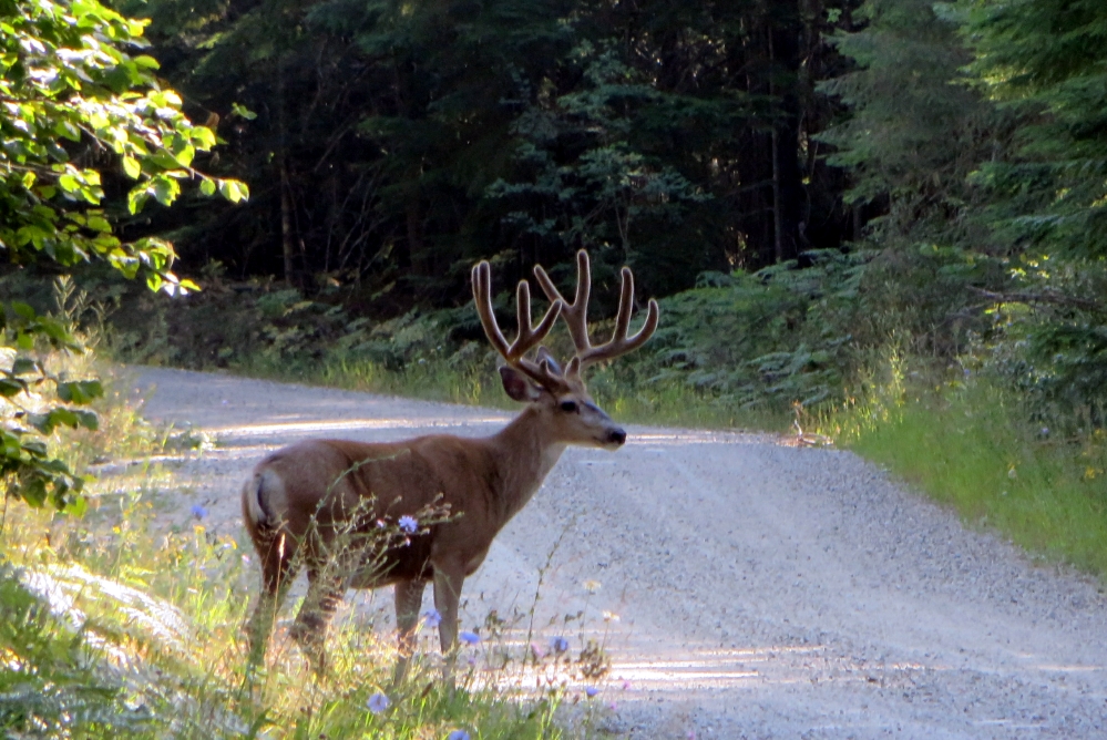 Every other day quite early in the morning I drove home to look after our yard and garden and to get fresh food supplies for our camping needs. On one of those trips I got very lucky. A buck was standing on the side of the road. I immediately stopped the car hoping to capture his majestic image on my digital camera. Alas, the camera was stored away somewhere in the back of the vehicle. I opened the door very quietly and stepped out on the road. The buck did not move. I walked to the back and opened the tail gate. The buck still did not move. I quickly grabbed my camera and aimed it at the buck, who was still standing at the same spot and then as if he wanted to pose for the picture turned his beautiful antlers in my direction. Then to my utter amazement he allowed me to approach him, while I was taking one picture after another. At 20 m he decided that I was a bit too close for comfort and trotted leisurely off into the forest. This encounter with one of the finest specimens in the animal kingdom made my day and I proudly shared his image on Flickr with the rest of the world.