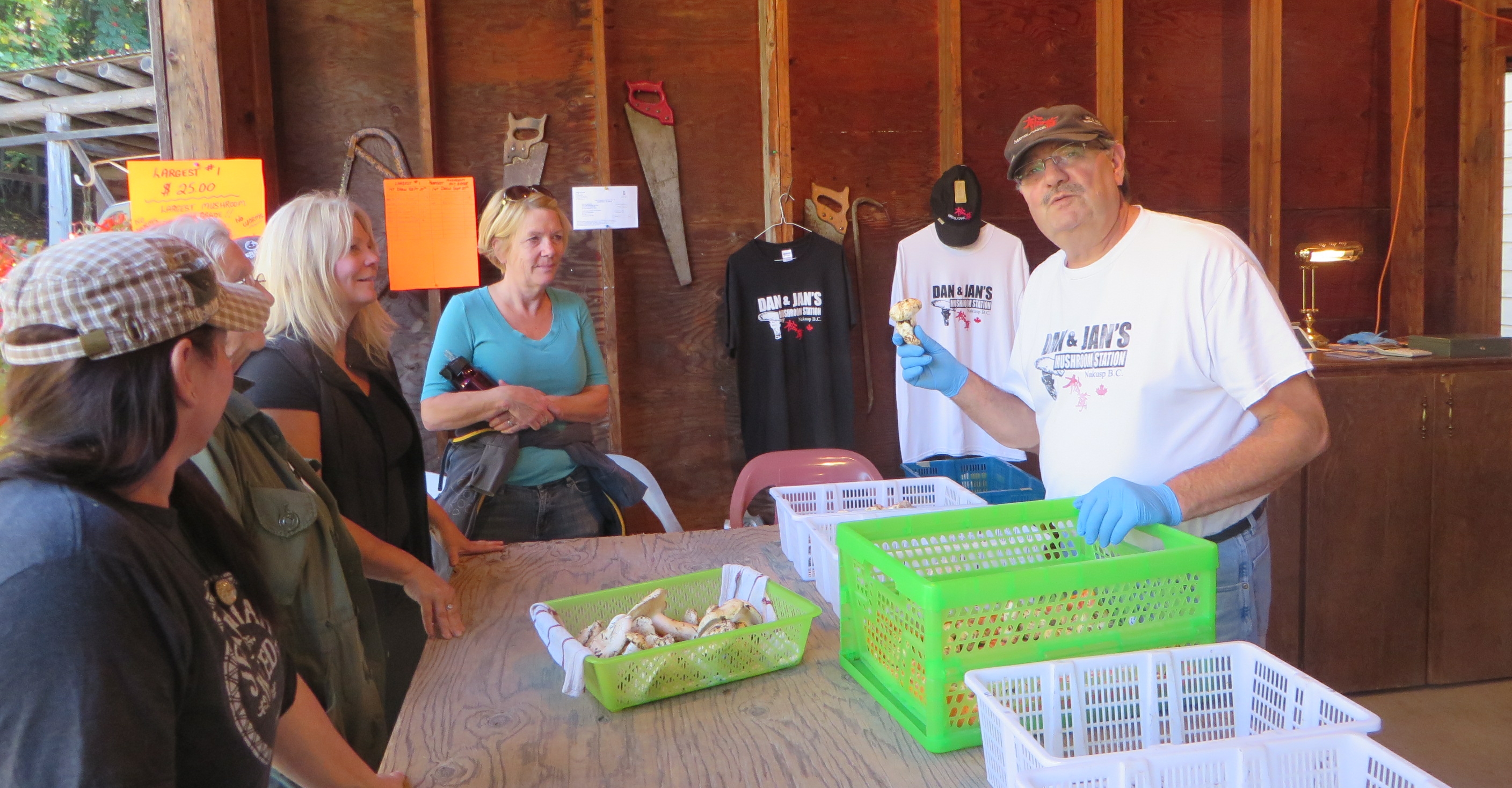 The set up has moved from her garage to a new building still being finished on her property with plenty of parking and a large walk-in cooler. She explains the unfinished building during an interview with the Arrow Lakes News as her mother answers the phone and groups of pickers come in carrying their bounty — large buckets of freshly picked fungi.