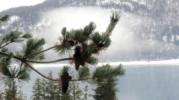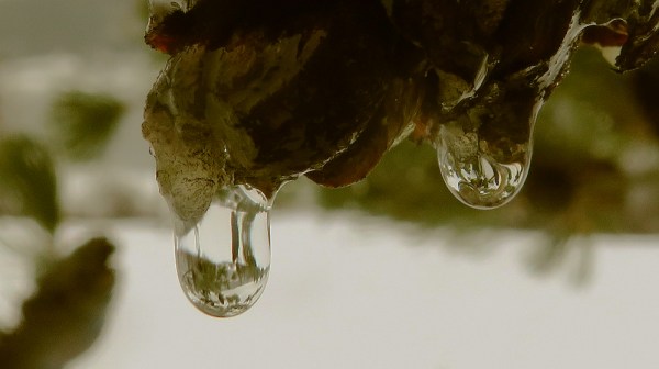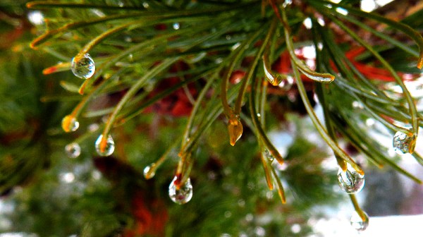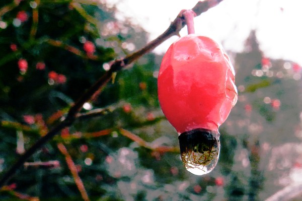 This has so far been the mildest winter, since we moved here over forty years ago. In the early 1980′, we experienced massive snowfalls with snow piling up all the way to our kitchen window. In the extreme cold weather often lasting several weeks in a row, the lake would occasionally freeze over and our ferry barely managed to break the ice in the morning. It seems that such extreme weather is now part of the past. After a night of wet snow covering the ground with a white blanket, rain, quite heavy at times, returned to our area at the Arrow Lakes. When it let up a little, my wife and I went out for our daily walk equipped with our cameras hunting for rain drops. Here are the results. Enjoy!