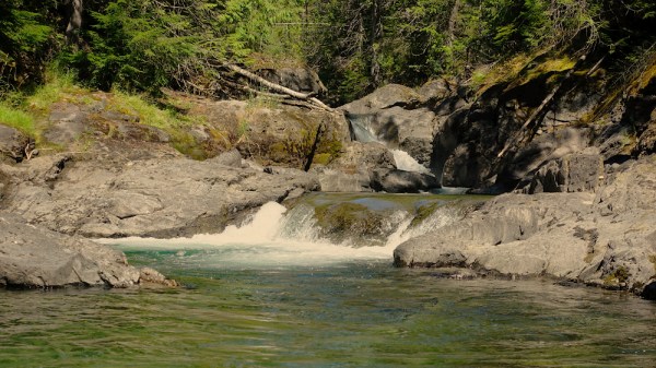Yesterday, Biene and I visited the waterfalls at the mouth of the Whatshan River. It was a hot day with a sizzling 32 degrees C. We stopped at our ‘island’ as we have often done in past summers and went for a swim in the crystal-clear and refreshing water between the rocky shoreline and the island. Then we paddled to the waterfalls, taking several pictures of the waterfall. Here is one that I like very much. Enjoy.