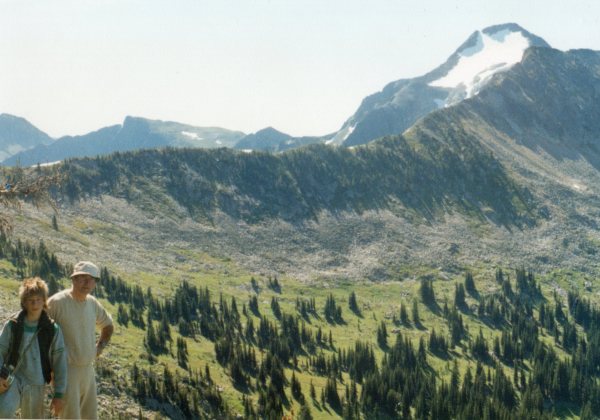 Our son Tony and I are on the plateau of McBride. (1986) The ridge behind us leads to the higher Mt. Hilda