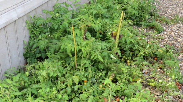 My wife planted the tomatoes in the soil under the gravel. They enjoyed the extra heat from the rocks.