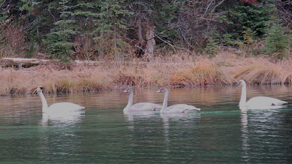 Life in the Kootenays is regulated by the ferry schedule. Last week, driving over the Monashee pass, we had 15 extra minutes. So we decided to stop at Lost Lake, which is located some 1200 m above sea level. Great was our surprise when we spotted four trumpeter swans that apparently made a short stop-over at this tiny mountain lake on their journey south to their winter quarters. They seem to be papa and mama swan with the two youngsters they had raised in the Yukon during the summer months. We had never seen these graceful birds in the wild.