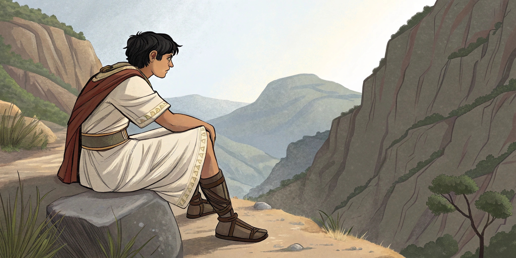 Der junge Römer stand, als er durch das Tor gegangen war, vor einer Weggabelung. Der schmale Pfad nach rechts führte an der Friedhofsmauer entlang, direkt zu den Meeresklippen, die er schon vom Schiff aus betrachtet hatte. Der Linke wandte sich in langen Serpentinen ins Innere der Halbinsel. Ein Dritter stieg geradeaus, nordwärts, ins Gebirge hinein. Dieser war so wenig begangen und so von Steinen bedeckt, dass man ihn kaum bei der schnell hereinbrechenden Dunkelheit erkennen konnte. Diesen musste der junge Römer einschlagen, wenn er den See finden wollte. Bis hierhin haben ihm die freundlichen Bewohner Bescheid sagen können. Jetzt musste er sich selbst zurechtfinden. Im Laufschritt stürmte er den leicht ansteigenden Berg hinauf. Denn wenn der letzte Schimmer des Tages verblasst war, konnte er leicht vom Weg abkommen und vielleicht in eine Schlucht oder ins Meer stürzen, dachte er bei sich. Aber seine Kräfte erschöpften sich bald, zumal es nun zunehmend steiler wurde. Er setzte sich auf einen Granitblock, um sich ein wenig auszuruhen. Er blickte hinauf zum Kamm des Berges und wurde zu seinem großen Schrecken gewahr, dass er vom steinigen Pfad abgekommen war. Oder war es vielleicht nur zu dunkel, dass der Weg und das Gelände gleich grau aussahen? Er wusste es nicht.