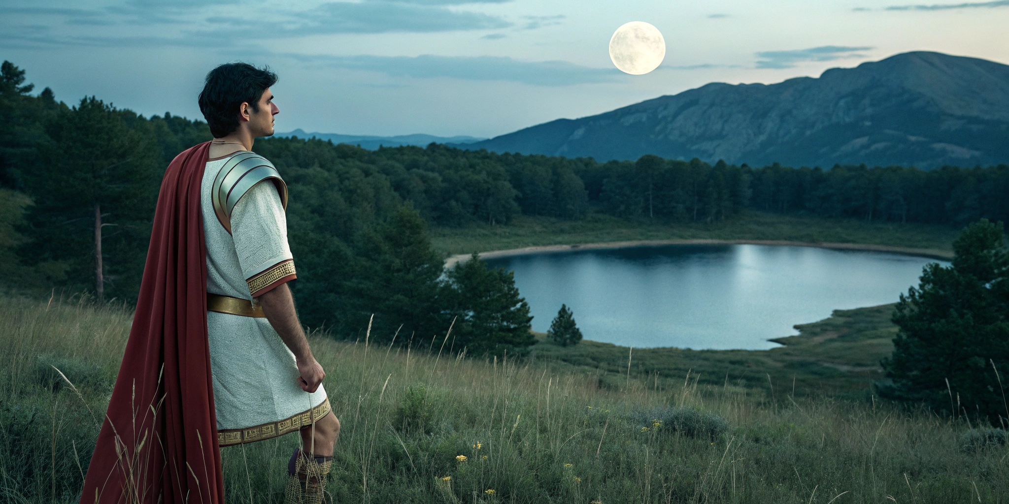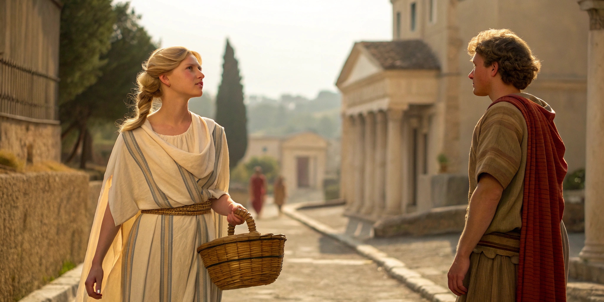 That’s why he immediately noticed the girl in the colourful dress and with a basket under her arm who was slowly strolling up the street. However, it was only at the last moment that he recognized Bersika. She was halfway past him when he stopped and turned to look at her. She stopped now, as if she had just been waiting, and smiled at him. Then he took courage and shook her both hands in the Roman style. After they had greeted each other and assured each other of their well-being, Publius chatted without haste and without shyness about his night’s stay at the mountain lake and its incredible beauty in the moonlight. A charming smile played around her mouth.