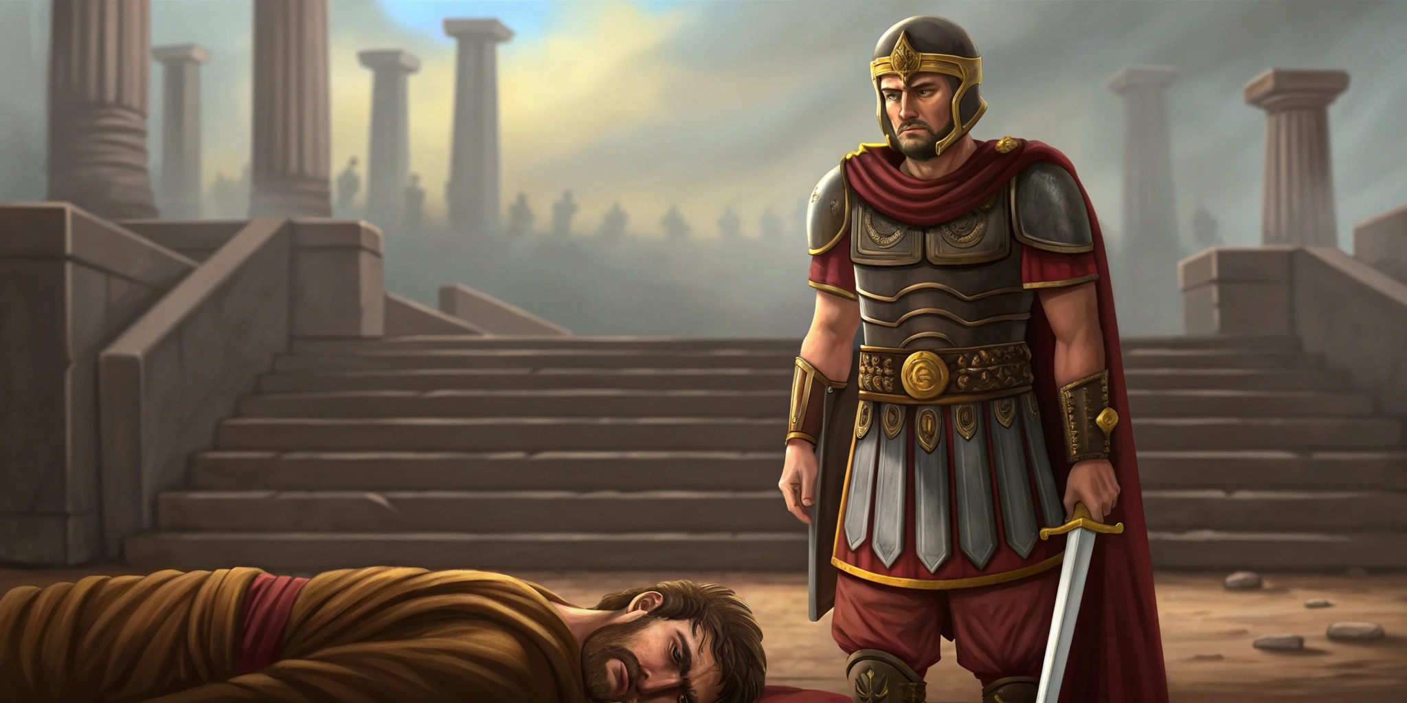 While his battered soldiers gathered for the battle for the citadel at the Temple of the Healing God, he secretly fled and plunged down the citadel steps. When a Roman confronted him, he threw down his gold-adorned tyrant’s sword as a sign of surrender and begged for mercy at the legionary’s feet! His mercy was granted by Scipio’s special order! Hasdrubald’s wife had watched her cowardly husband in a fit of anger, since he had irresponsibly driven tens of thousands to their deaths with his slogans of perseverance and now lacked the courage to voluntarily end his life.