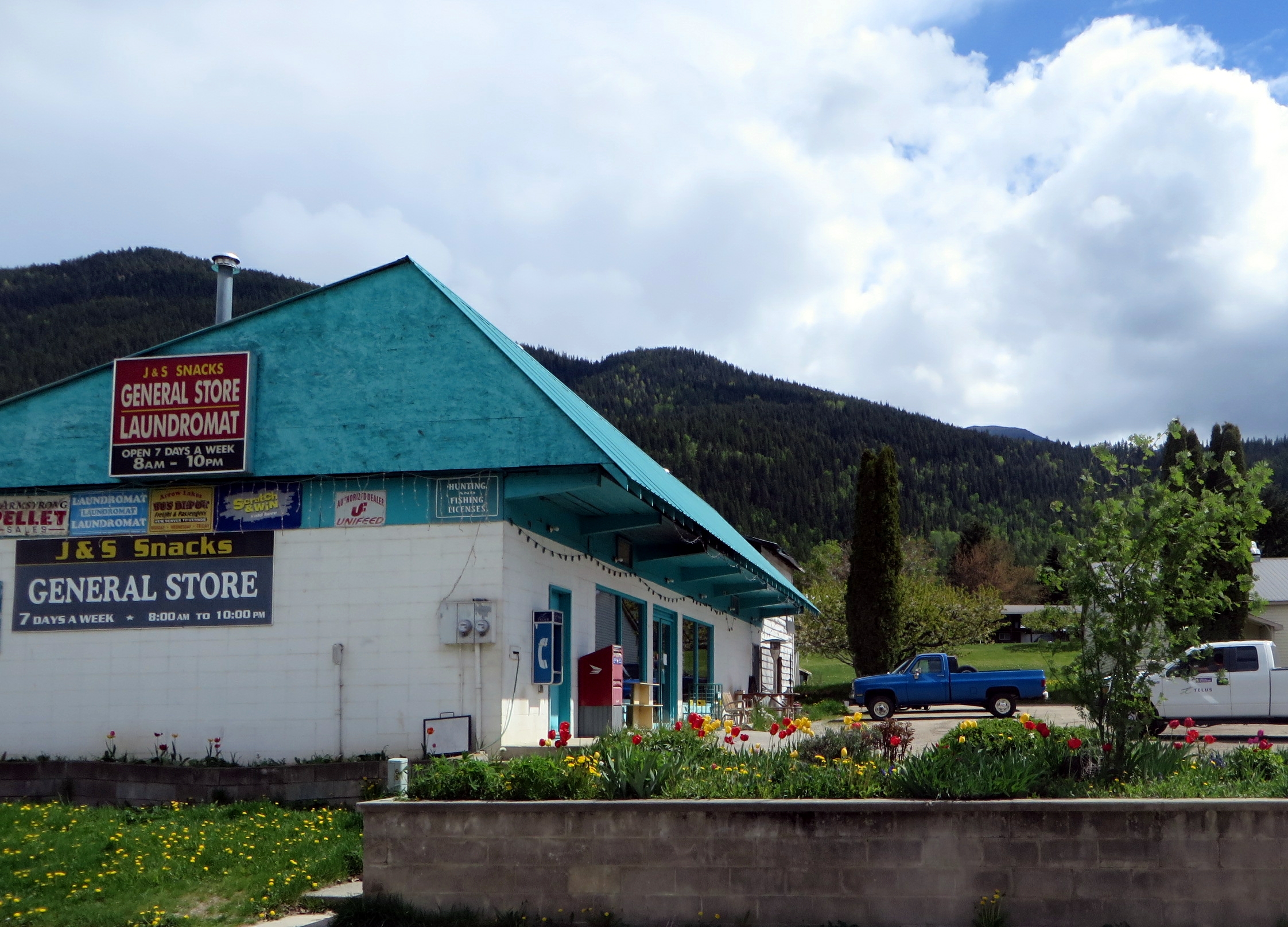 We start our walk at the General Store, where a bed of tulips adds color to the country store.