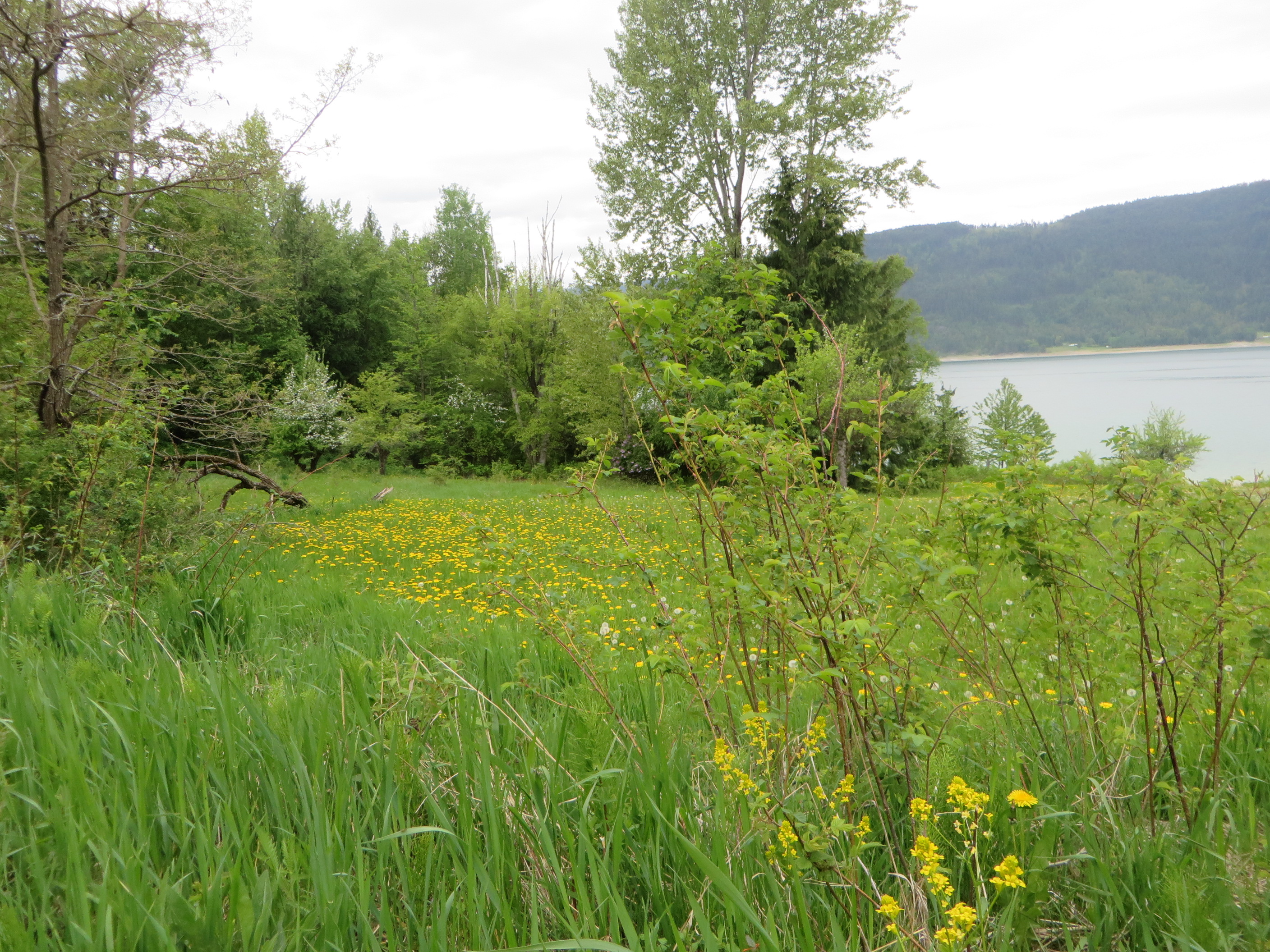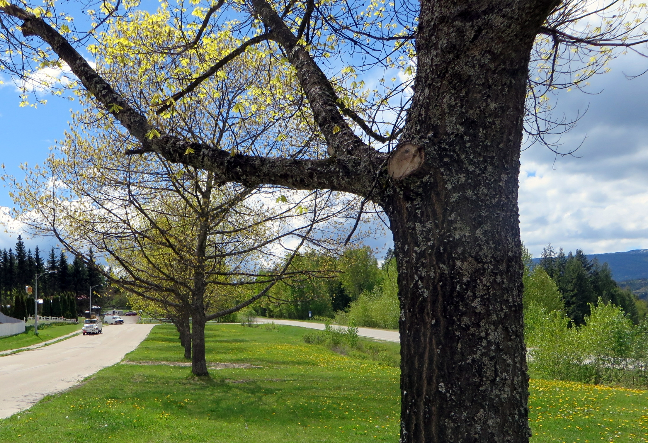 In February I tried very hard to show beauty on a foggy and drizzly day. But this time in the middle of a gorgeous spring, I don’t even have to try. Nature has fully sprung into action. With its dandelion-speckled meadows, the fragrance of apple blossoms in the air, birds twittering in the cedar trees, with its glorious presence Nature is creating a more joyful mood. Today I suggest a more leisurely walk around our beautiful community. If you take the time to stop often to look at the landscape and listen to the birds chant their cheerful songs, you will need about 40 minutes to complete the loop.