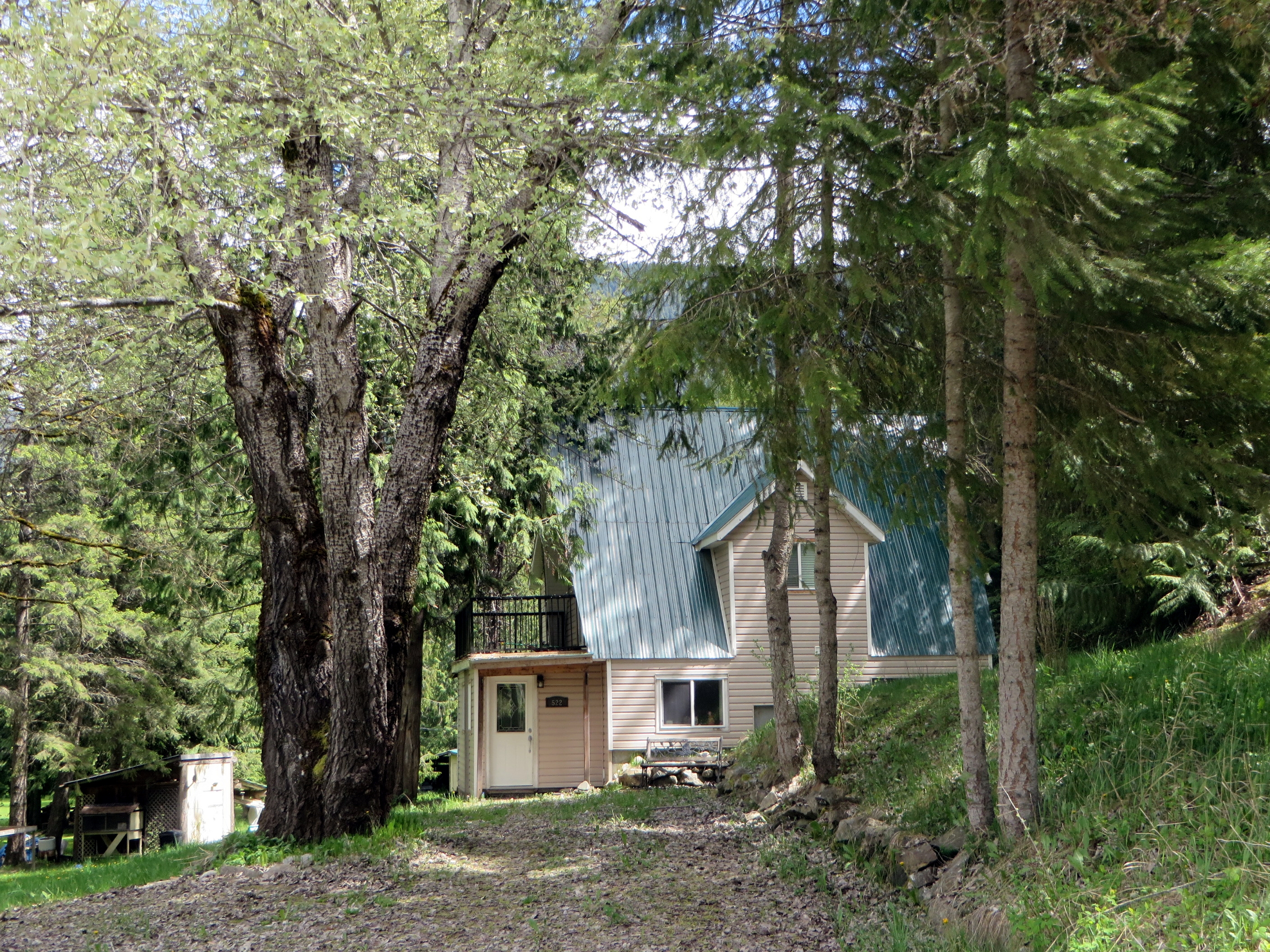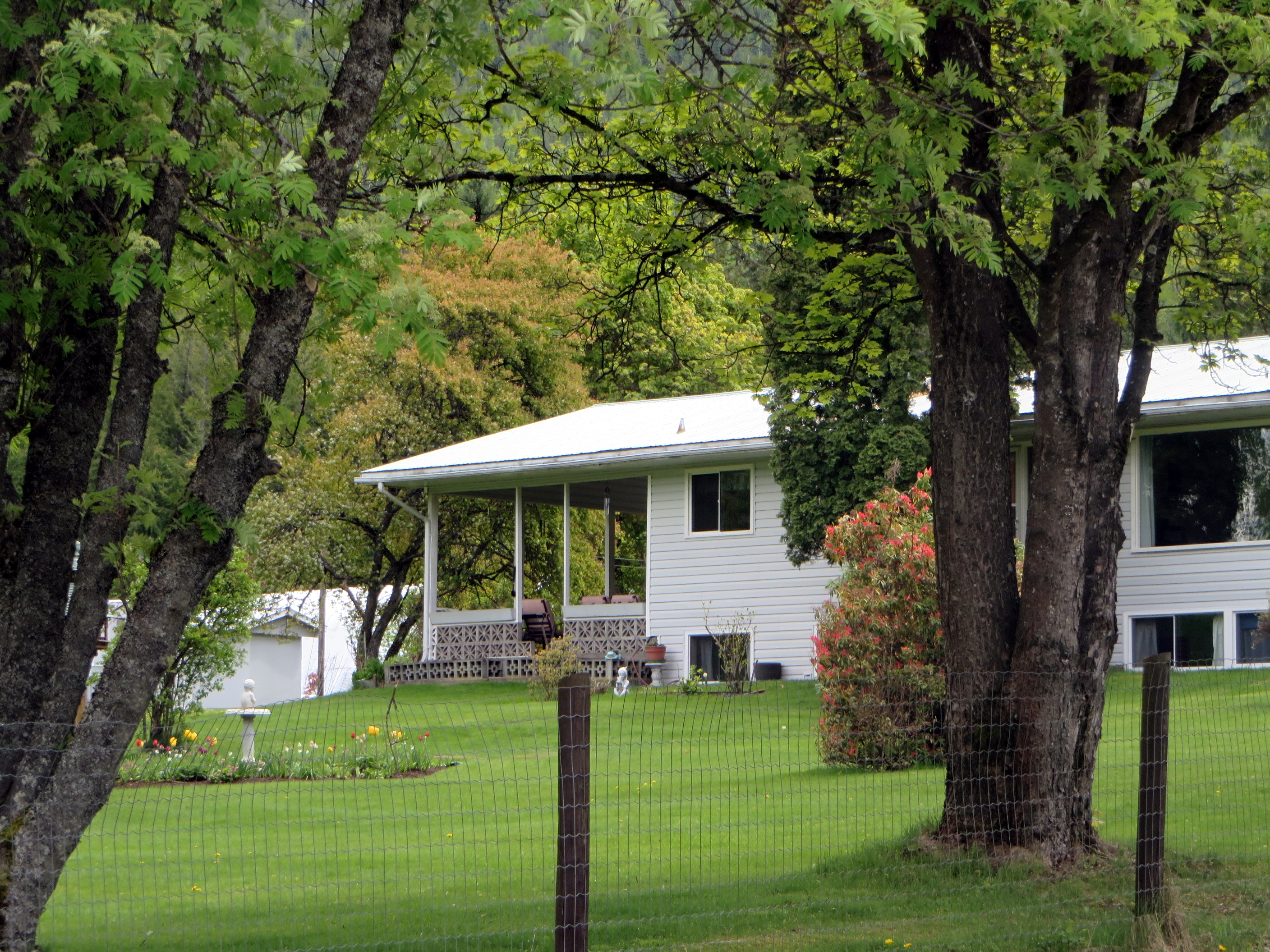 A neighbor farther up the hill is completed surrounded by shrubs and trees.