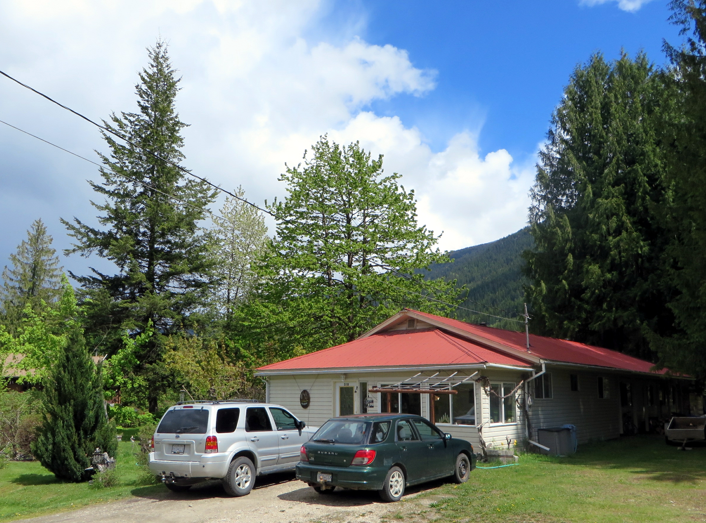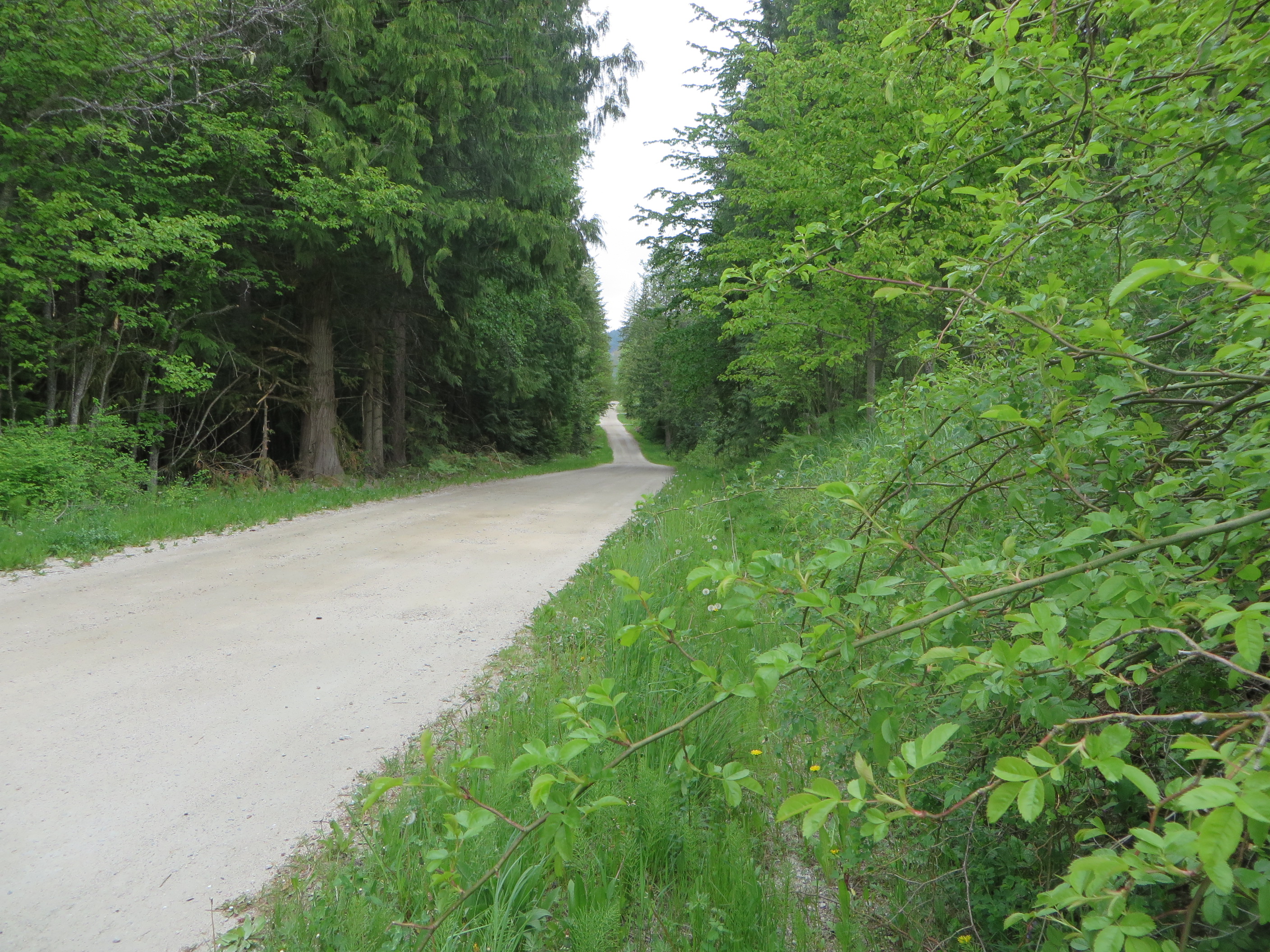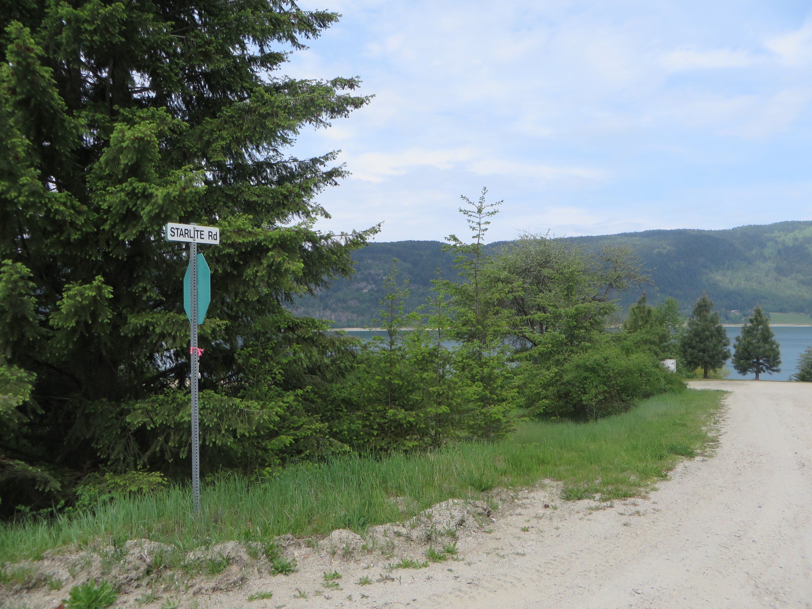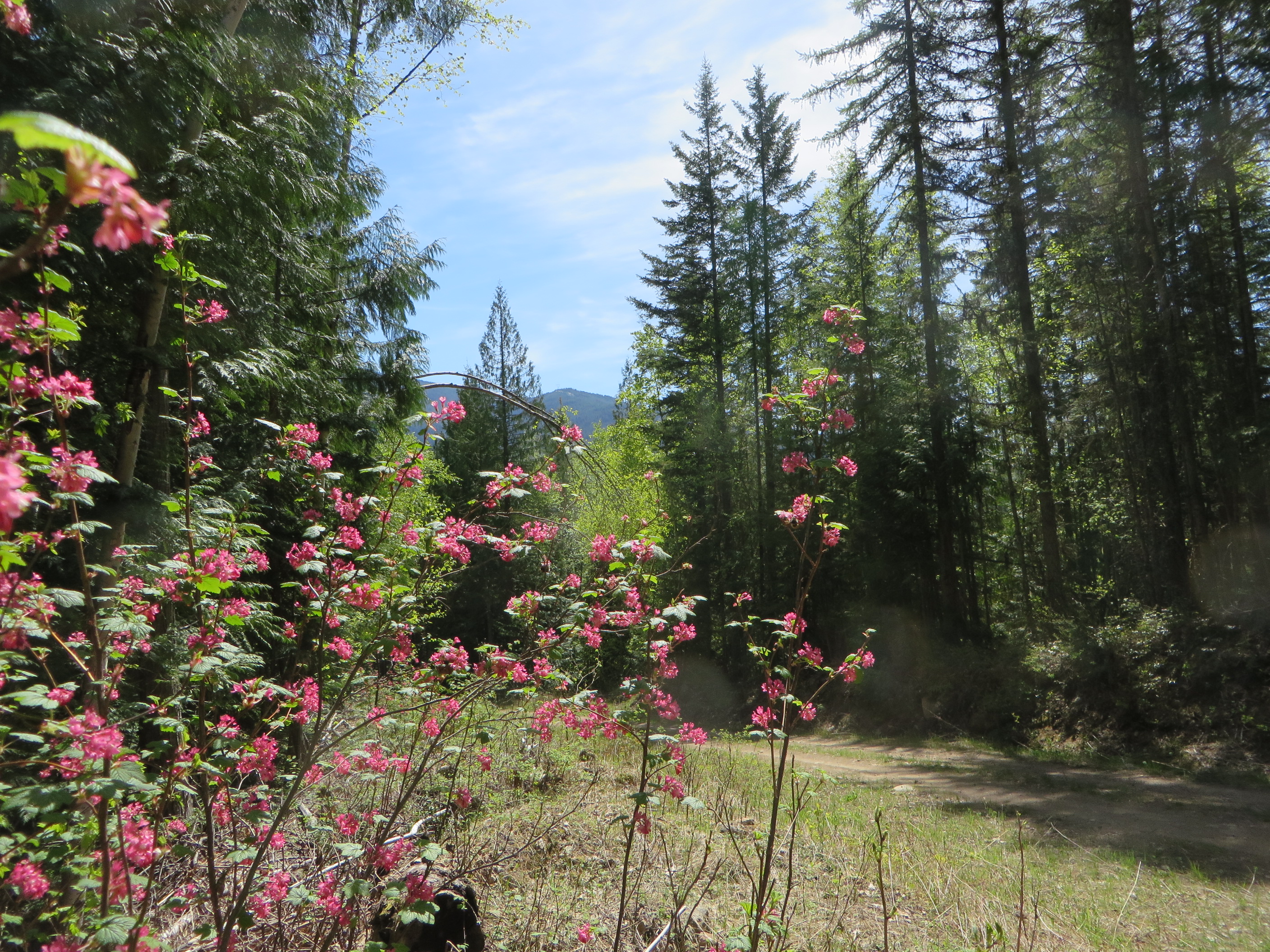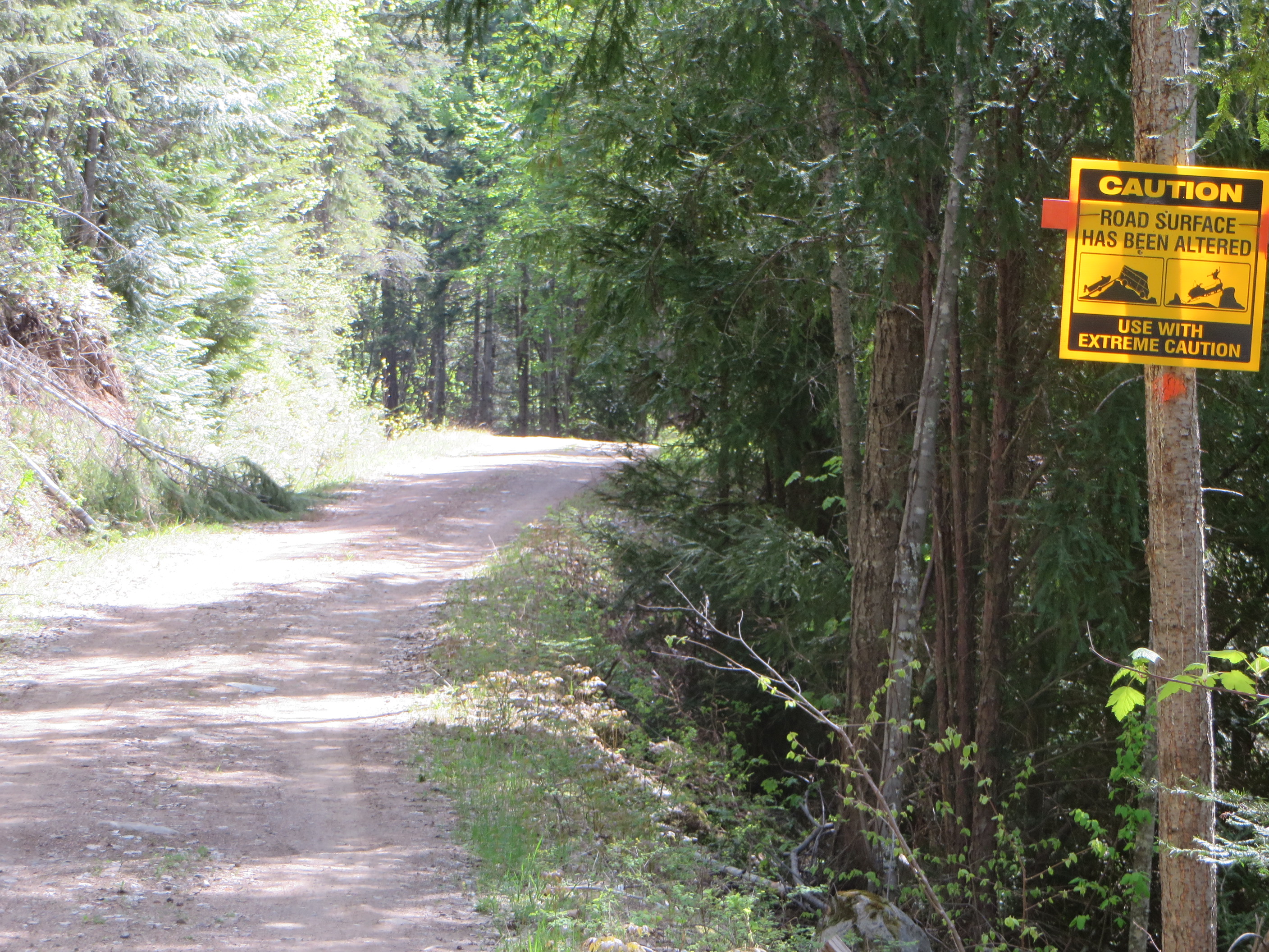The ‘Pin Creek Trail’ is actually a logging road. But logging trucks rarely use it at the present time. It is is quite a pleasant way to explore the back country of Applegrove south of Fauquier. To get there, you start at the Arrow Motel in Fauquier and travel 7.6 km south on the Applegrove Road. I recommend you park your vehicle at the fork and start your hike from there. There is a sign warning you about road safety and it advises to use extreme caution. Any car with a low clearance will have trouble crossing the water bars.