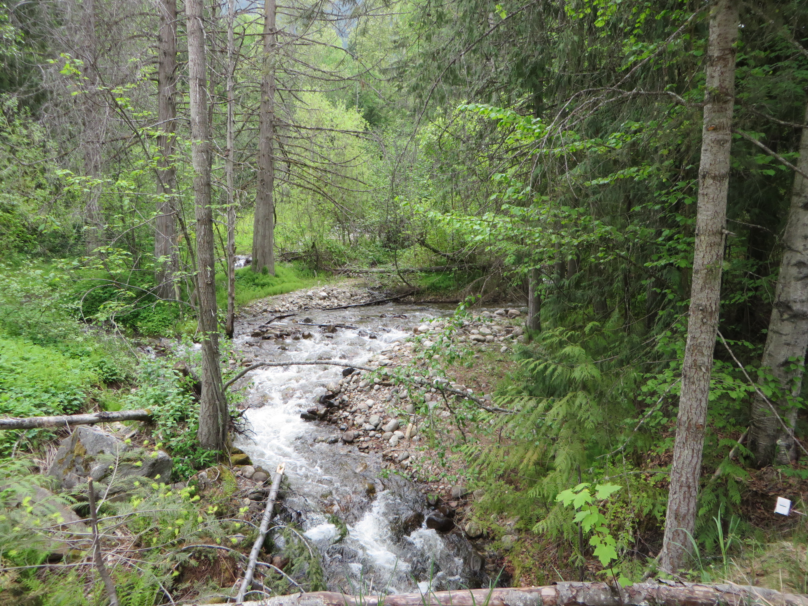 Some other time you may wish to add three expansions to the itinerary, for which you should plan at least half a day to fully enjoy it. Forestry people told me that the side road, which I mentioned earlier in this post, takes you over a bridge to a number of cut blocks at a much higher elevation. Once there you will enjoy fantastic views into the valley below and the mountains on the Edgewood side across the Arrow Lake. You could also continue on the Pin Creek road, which will take you to Heart Creek. It provides the drinking water for Fauquier below. There used to be a bridge. In the spring of 1985, the creek swollen by heavy rains and melt water completely destroyed the bridge.